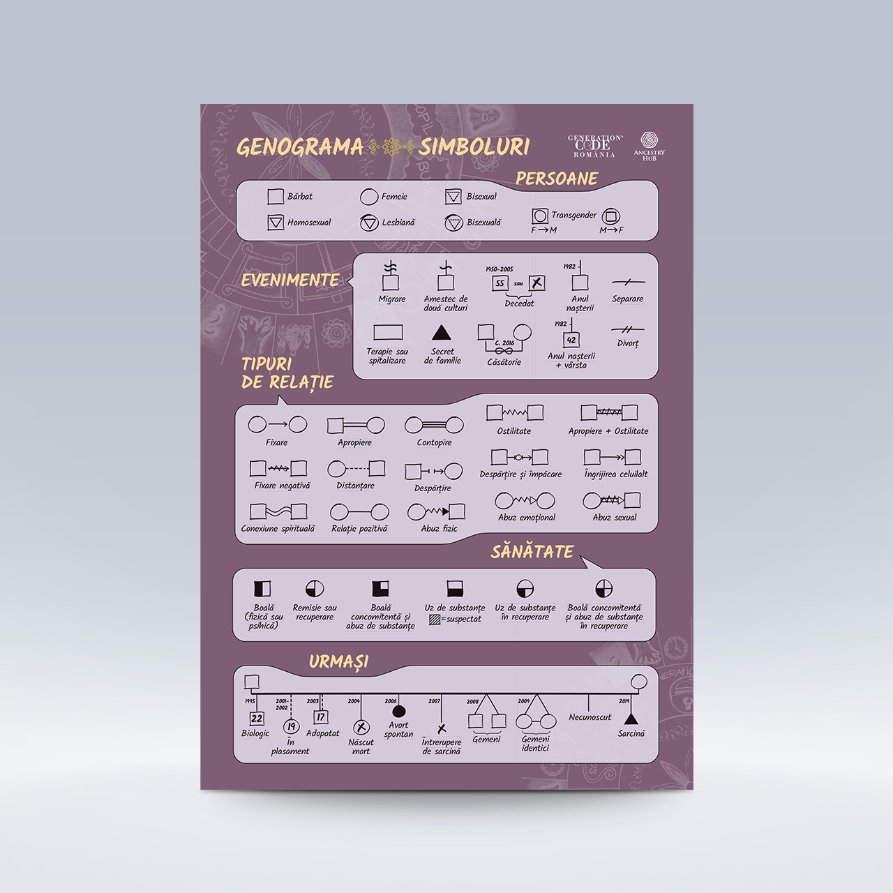 - Acces ușor – Afișat în spațiul de lucru, posterul permite o utilizare intuitivă și rapidă a simbolurilor genogramei, facilitând sesiunile de consiliere și terapie.